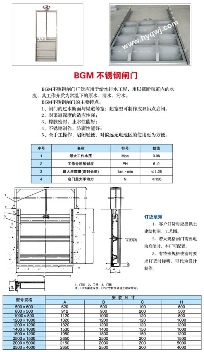 BGM不銹鋼閘門(mén)廣泛應(yīng)用于給排水工程,用以截?cái)嗲纼?nèi)的水流,其工作介質(zhì)為常溫下的原水、清水、污水。